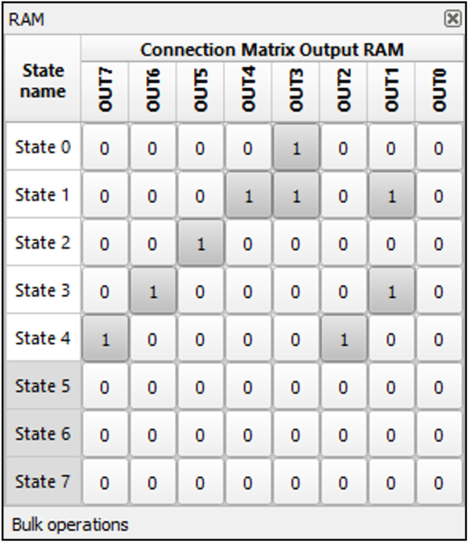 为了确保机电继电器正常工作,通过使用ASM块的反馈中的延迟来控制突然的状态转换。为此,ASM块OUT3、OUT4、OUT5、OUT6和OUT7的输出分别被馈送到延迟块DLY2、DLY3、DLY4、DLY5和DLY6。图5描述了ASM的RAM块的配置,其中显示了每个二进制输出OUT0–OUT7的状态。