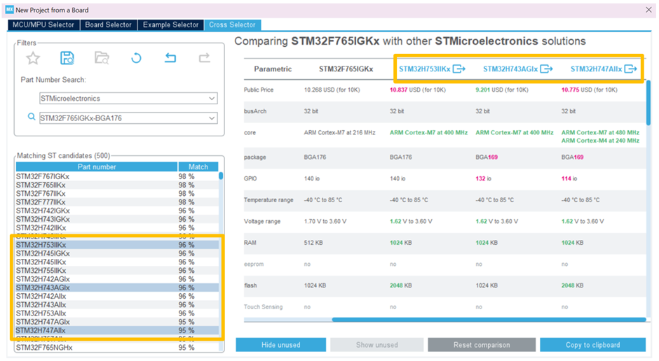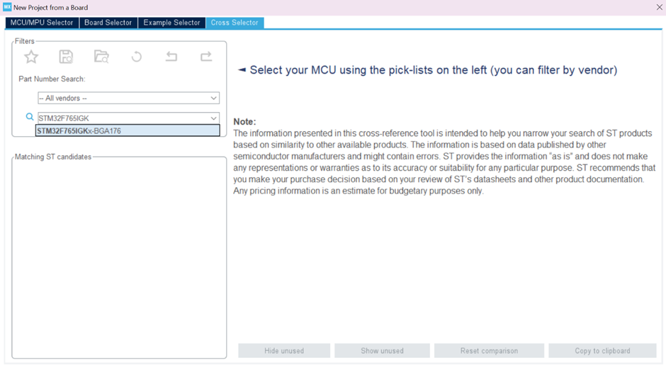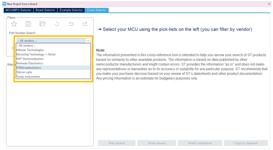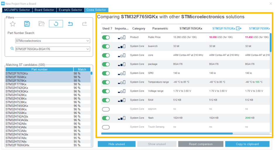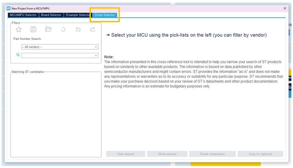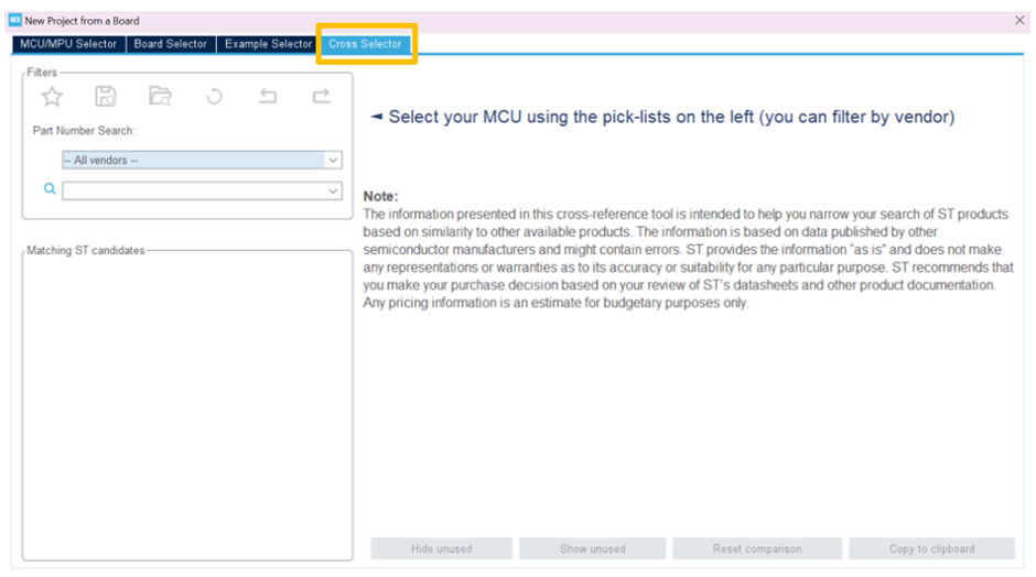 交叉选择工具是嵌入STM32CubeMX中的一种工具,允许用户查看、比较和查找STM32产品组合中最能取代当前MCU或MPU的产品,无论这些产品来自ST还是其他硅供应商。