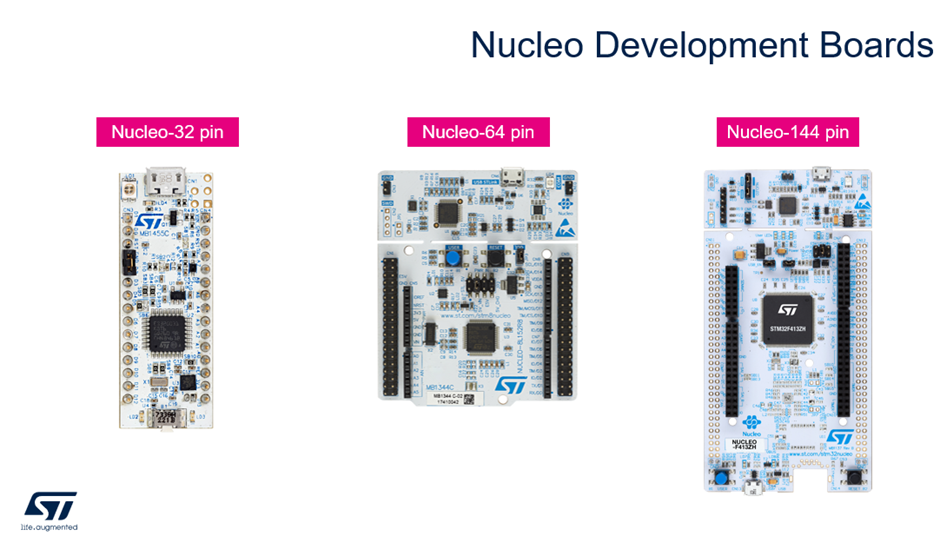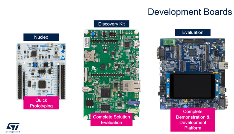 ST提供了三种类型的原型板:Nucleo板、发现套件和评估板。ST用于评估STM32 MCU的工具包括价格合理的社区支持工具和设备齐全的板,可用于评估所选STM32系列的每一项功能。