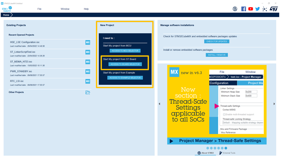 要访问交叉选择器工具,请从STM32CubeMX应用程序的主屏幕开始。在“新建项目”部分下,从以下任意一个图标中进行选择:访问MCU选择器、访问板选择器或访问示例选择器。