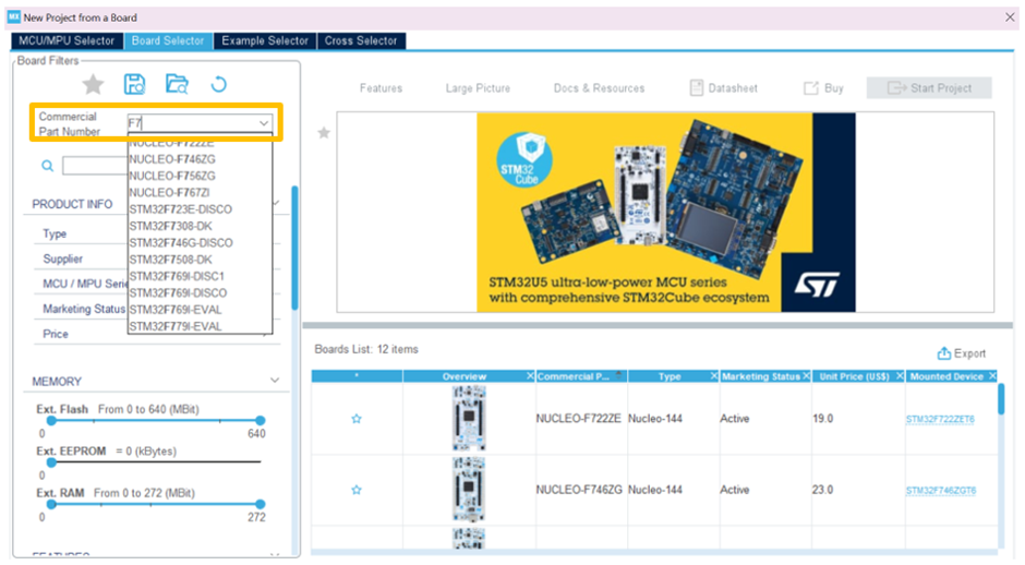 步骤2。开始在Commercial part number(商业零件号)字段中键入零件号,您应该会看到STM32F7填充的可用板的列表。扫描填充的列表,查看您输入的STM32零件号是否与ST现有的任何硬件板匹配。