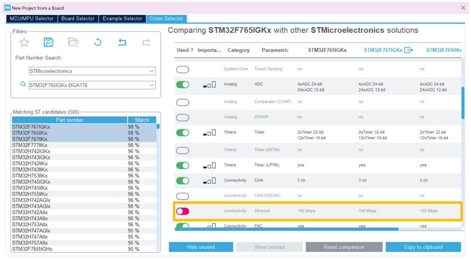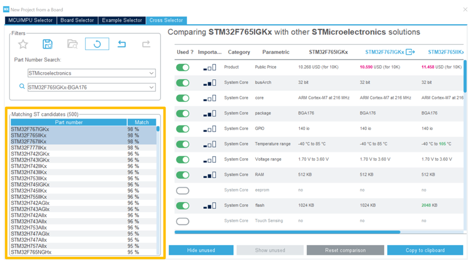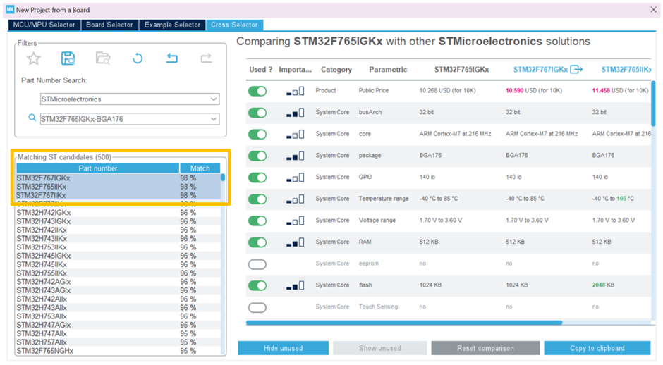 步骤8。记下前三名匹配的ST候选人。在这种情况下,与我们选择的STM32F765IGK6最接近的零件号为: