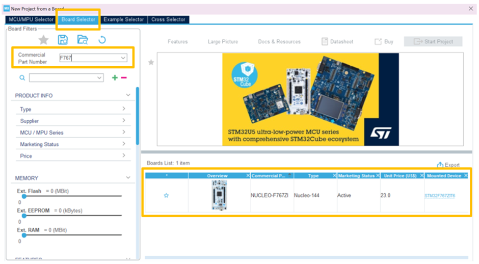 步骤9。使用这些可比较的STM32零件号,重复步骤2。再次,我们将选择板选择器选项卡,并输入STM32零件号“F767”,这是上一步匹配ST候选人列表中的第一个匹配项。