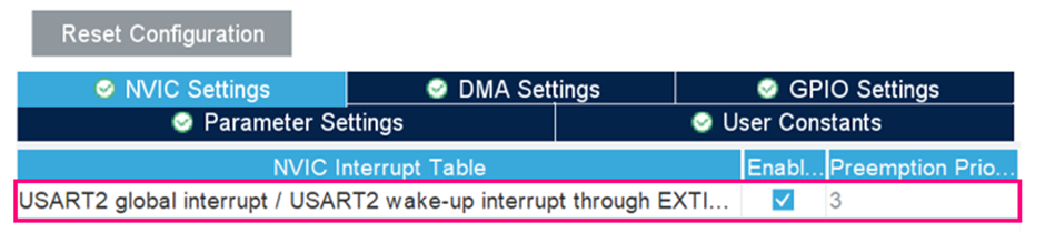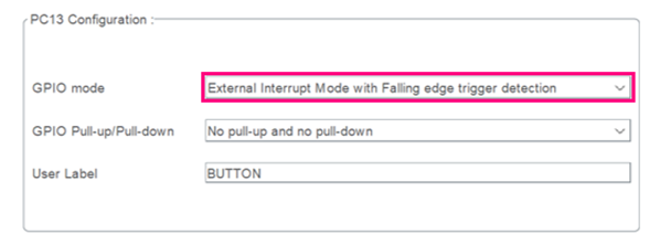 下一步是将用户按钮(PB13)配置为外部中断,因为它将在必要时触发调用scanf函数。配置后,转到System Core>GPIO,将带下降沿触发检测的外部中断模式置于GPIO模式,标记并选中NVIC框“EXTI line 4 to 5 interrupts”。