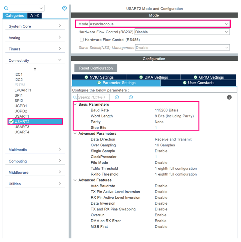 现在是时候配置扫描功能重定向到的UART了。在Connectivity>USART2上,选择异步模式,在Parameter Settings(参数设置)中设置Basic Parameter(基本参数),如下图所示,并选中NVIC框以查看USART2的全局中断。