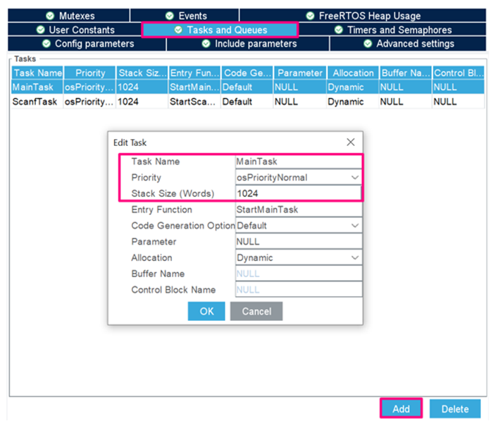 该应用程序由两个任务组成:一个任务包含scanf函数,另一个任务控制其调用。控制器任务(MainTask)的优先级将高于受控任务(ScanfTask)。在“任务”和“队列”中,添加任务并将其配置为下图所示: