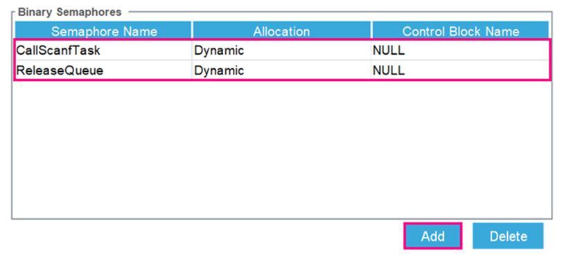 最后,将使用两个信号量:一个用于启用scanf函数任务的执行,另一个用于通过打印到目前为止接收到的输入数据来启用队列的返回值。在“计时器和信号量”选项卡上,添加两个信号量并命名它们。