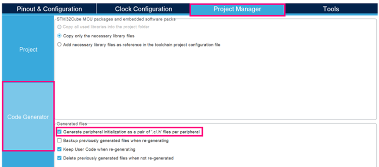 现在,生成代码的最后一个挂起的配置是生成外围初始化,其中“.c/.h”文件是分开的。转到“项目管理器”部分,在“代码生成器”选项卡上,选中“生成的文件”区域的第一个框。