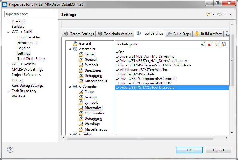 然后转到“工具设置”选项卡和“C编译器”->“目录”部分