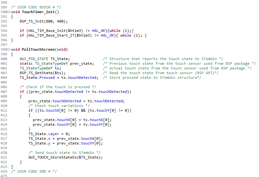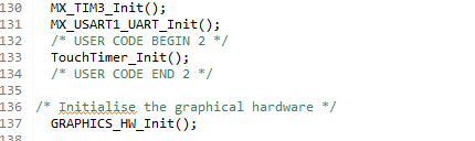 您现在有了一个启用了触摸屏功能的功能性图形应用程序,由于所有额外的源代码都已添加到特定的用户部分,您可以自由地从CubeMX工具启用和配置其他外围设备,并在不丢失源代码的情况下重新生成源代码。