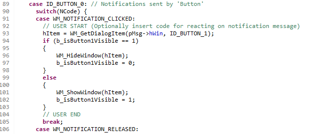 - 在cbDialog函数的WindoDLG.c文件中,在USER START/END部分添加大小写ID_BUTTON_0和大小写WM_NOTIFICATION_CLIKED