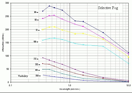 如今,人们倾向于开发能在近红外光谱之外工作的FSO系统,例如2.2微米左右的中红外光谱,甚至包括量子级联激光(约10微米)。然而,不管使用的是什么波长,在雨雪等天气中(具有较大的悬浮物颗粒),所有基于FSO的系统都具有类似的表现。在大雾天气,长波系统更有优势,因为它受大气衰减的影响较小。表1展示了不同波长和能见度下的衰减曲线。