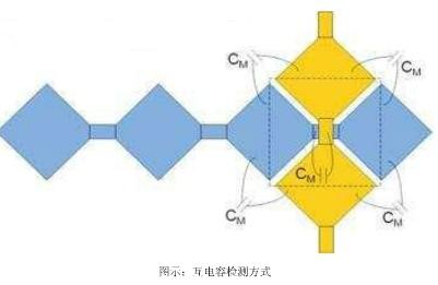 Multi-Touch All-Point 基于互电容的检测方式,而不是自电容,自电容检测的是每个感应单 元的电容(也就是寄生电容 Cp)的变化,有手指存在时寄生电容会增加,从而判断有触摸 存在,而互电容是检测行列交叉处的互电容(也就是耦合电容 Cm)的变化,如图 2 所示, 当行列交叉通过时,行列之间会产生互电容(包括:行列感应单元之间的边缘电容,行列交 叉重叠处产生的耦合电容),有手指存在时互电容会减小,就可以判断触摸存在,并且准确 判断每一个触摸点位置.