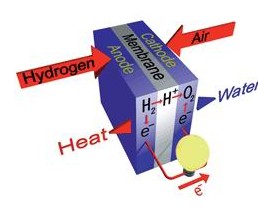 在质子交换膜燃料电池中,电解质是一片薄的聚合物膜,例如聚[全氟磺]酸(poly[perfluorosulphonic]acid),和质子能够渗透但不导电的NafionTM ,而电极基本由碳组成。氢流入燃料电池到达阳极,裂解成氢离子(质子)和电子。氢离子通过电解质渗透到阴极,而电子通过外部网路流动,提供电力。以空气形式存在的氧供应到阴极,与电子和氢离子结合形成水。在电极上的这些反应如下: