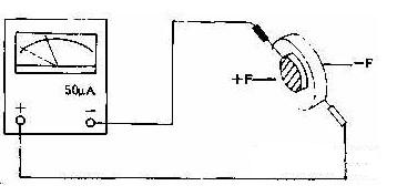 利用万用表50uA挡,也可以检查压电陶瓷片的好坏。电路如图2所示。将红表笔接金属片,黑表笔接压电陶瓷表面。两手沿轴向施以作用力+F、-F时,表针应向右摆几个微安;再松开手时,表针又向左摆几个微安;设施力与松力时间均为dt,则通过微安表的电流平均值分别为:I=+Q/△t,I2=-Q/△t。