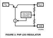 在LDO(Low Dropout)稳压器(图2:LDO稳压器内部结构框图)中,导通管是一个PNP管。LDO的最大优势就是PNP管只会带来很小的导通压降,满载(Full-load)的跌落电压的典型值小于500mV,轻载(Light loads)时的压降仅有10~20mV。LDO的压差为: