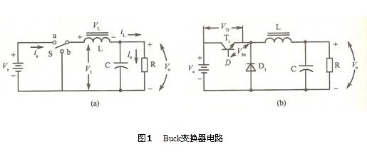 图1(a)所示为由单刀双掷开关S、电感元件L和电容C组成的Buck变换器电路图。图1(b)所示为由以占空比D工作的晶体管Tr、二极管D1、电感L、电容C组成的Buck变换器电路图。电路完成把直流电压Vs转换成直流电压Vo的功能。