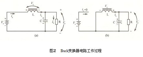 当开关S在位置a时,有图2 (a)所示的电流流过电感线圈L,电流线性增加,在负载R上流过电流Io,两端输出电压Vo,极性上正下负。当is>IIo时,电容在充电状态。这时二极管D1承受反向电压;经时间D1Ts后(,ton为S在a位时间,Ts是周期),当开关S在b位时,如图2(b)所示,由于线圈L中的磁场将改变线圈L两端的电压极性,以保持其电流iL不变。负载R两端电压仍是上正下负。在iL<Io时,电容处在放电状态,有利于维持Io、Vo不变。这时二极管D1,承受正向偏压为电流iL构成通路,故称D1为续流二极管。由于变换器输出电压Vo小于电源电压Vs,故称它为降压变换器。工作中输入电流is,在开关闭合时,is>00,开关打开时,is=0,故is是脉动的,但输出电流Io,在L、D1、C作用下却是连续的,平稳的。