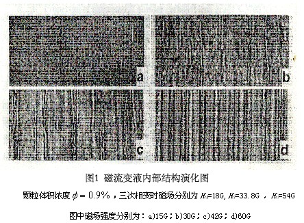 图a:当H < Hc1时,磁流变液完全处于流体状态,铁磁颗粒随机分布;