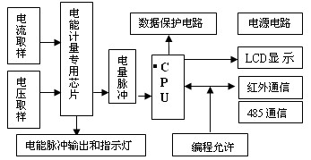 电能表工作时,用户消耗的电能转换为电压、电流信号,经取样电路分别取样后,由电能表专用集成电路处理成为与消耗功率成正比的脉冲信号,MCU记录电量脉冲并存储。根据时钟和时段的内容分别处理和记录对应时间段内的电量,LCD循环显示用户选择的参数存储信息数据可通过红外抄表机或RS485通讯接口进行信息数据传输。