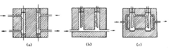 (1)通常TCD池 通常TCD池按载气对热丝的流动方式(见图3-2-4)可分直通式(a)、扩散式(b)和半扩散式(c),三种流型性能比较见表: