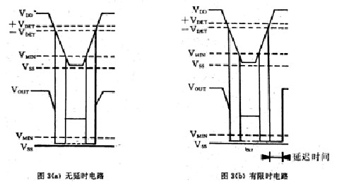 当输入电压(VDD)从地电位上升时,延时电路将产生一定的延迟时间tDLY。输入电压(VDD)超过释放电压(+VDET)后,要经过一定的时间tDLY,输出电压才等于输入电压,如图3(b)表示。