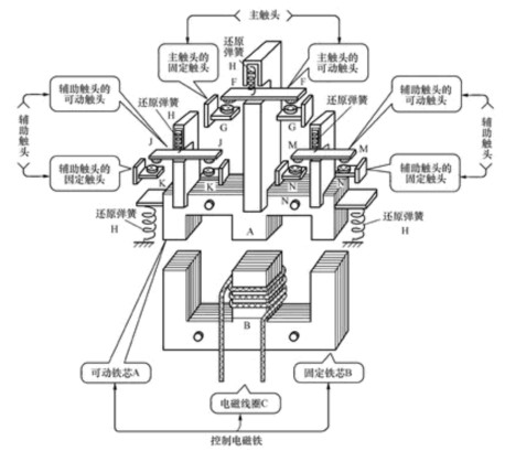 包括主触点和辅助触点。主触点用于通断主电路,通常为三对常开触点。辅助触点用于控制电路,起电气联锁作用,故又称联锁触点,一般常开、常闭各两对。