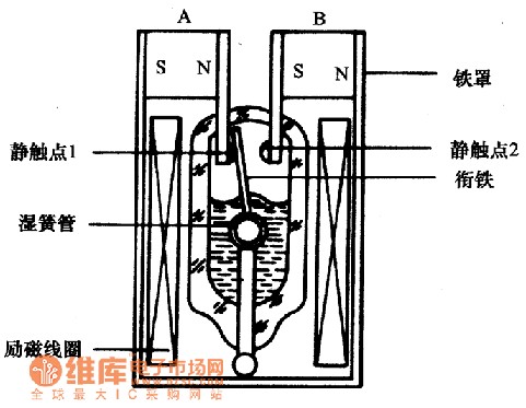 磁保持湿簧管继电器的内部结构如图所示。由湿簧管、激励线圈、衔铁、永久磁铁等构成。磁保持湿簧管继电器的工作过程是:当激励线圈通过电流时,衔铁被吸向一侧的静触点1,与静触点2断开,此时衔铁在永久性磁铁A的吸引下与1静触点保持接通,当激励线圈中的电流消失,衔铁因有永久磁铁A的作用,仍与1静触点保持接通状态。如果耍使衔铁改变状态,必须改变激励线圈的激励磁场的方向,否则这种状态将继续保持下去。