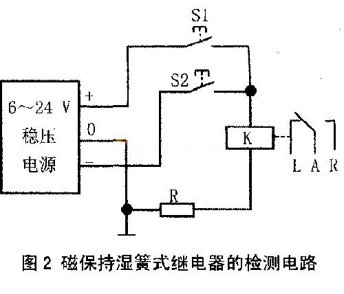 (2)检测激励线圈:如图2所示。用直流稳压电源(6~24 V)给磁保持湿簧式继电器的激励线圈加一个正脉冲电压或负脉冲电压,看湿簧式继电器的衔铁片是否能动作。若衔铁片不动作,则是激励线圈已损坏。