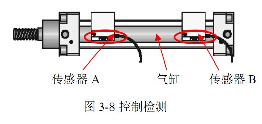 如图 3-8 所示,为了知道气缸活塞的两个绝对位置(最内端和最外端),就可以用两个磁感应传感器来检测。在气缸活塞环上,包有一层“永久磁铁”。当活塞往外运动到最外端时,传感器A就发出信号(一般传感器上有指示灯);当活塞往内运动到最内端时,传感器B 就发出信号。这样就可以检测气缸活塞的位置。