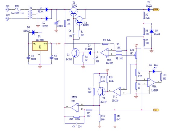 本电路设有反极性保护电路,由D4,U1C,U1D,T1及外围元件构成,当电池反接时,充电器限制输出电流不致发生事故。充电指示由U1A,D7及外围元件构成,充电时,D7点亮,充电器进入浮充状态后,D7熄灭,表示充电结束。